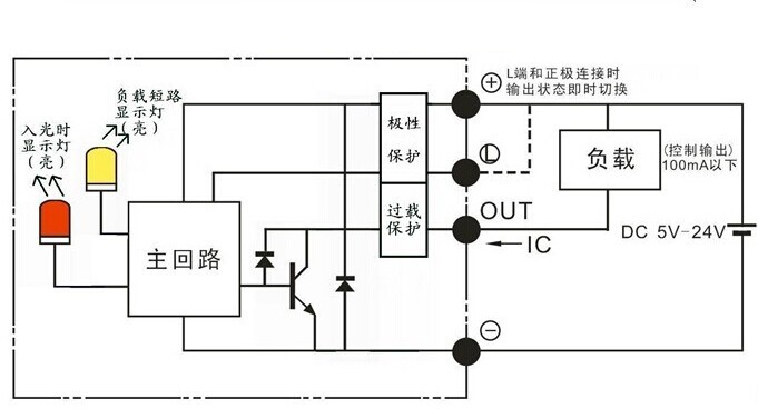 受光時指示燈亮,NPN集電極無輸出;遮光時指示燈滅,NPN集電極開路輸出DC5V--24V 、 100mA以下, 殘留電壓0.5V以下(負荷電流100mA時)、殘留電壓0.3V以下(負荷電流40mA時)