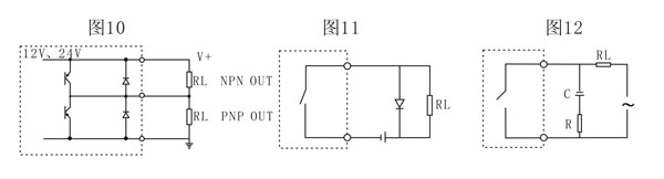 接點工作有兩種方式:直流方式和交流方式。在兩種方式下對負荷的性質(zhì)未能加限制,可接入阻性負荷或感性負荷,但是這兩種方式下使用上略有不同,如圖11所示,是直流方式的接線法,圖12是交流方式的接線法。
