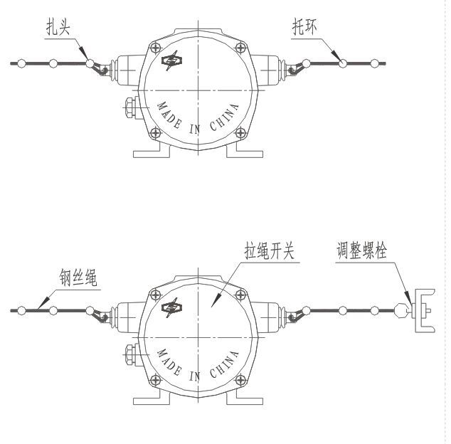 當(dāng)膠帶運(yùn)輸現(xiàn)場(chǎng)發(fā)生緊急事故時(shí),拉動(dòng)系在吊耳上的鋼絲繩,是機(jī)內(nèi)的滑塊與開(kāi)關(guān)作用,發(fā)出停機(jī)信號(hào)。 松開(kāi)鋼絲繩后開(kāi)關(guān)自動(dòng)復(fù)位。